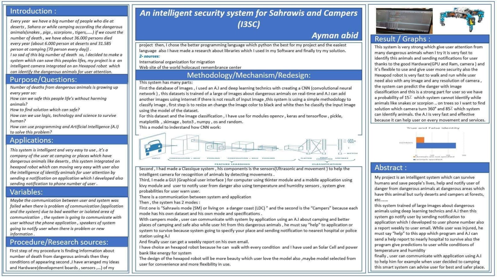 Spider robot capable of detecting dangerous animals and sending alerts via a mobile app.